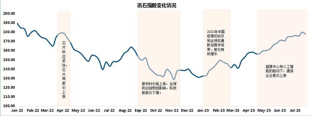 細分領域來看,ICC所統(tǒng)計的互聯網內容運營商股指為125.08,相比上個月的120.85增長了3.5%。AI 和數字經濟快速發(fā)展,算力需求依然強勁,云廠商基于新應用和新內容增長,加大對云計算基礎設施投入?;ヂ摼W內容運營商本月呈增長趨勢。運營商指數為83.39,與上月相比基本持平。設備商股指為108.62,相比上個月的109.55下滑0.85%。二季度財報季開始,公布財報的外設備商表示受到銷庫存影響,營收增長放緩。器件商股指為200.28比上月的222.06下滑9.81%。光通信行業(yè)市場調研機構 LightCounting 在最新一期的市場報告中指出,2023 年第一季度光模塊和相關產品的銷售額下降了 27%,而第二季度的需求仍然疲軟。芯片商股指為294.33,比上月增長2.28%。中國商務部、海關總署發(fā)布《關于對鎵、鍺相關物項實施出口管制的公告》,芯片企業(yè)股價7月出現了增長。光纖光纜商股指為110.4,相比上月下滑1.69%。長期來看,海纜的代際交替帶來建設熱潮,光纖光纜需求依然強勁。