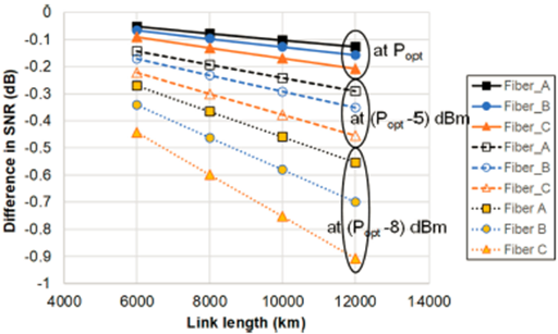 研究人員指出了光纖的類型對SNR模型差異有一定的影響,即具有較高衰減和/或較高非線性損傷的光纖具有較低的性能,因此在鏈路的末端具有低SNR。此外較低的SNR也會造成更大的模型差異。該結(jié)論對實際系統(tǒng)設(shè)計和建模分析都有一定的參考價值。