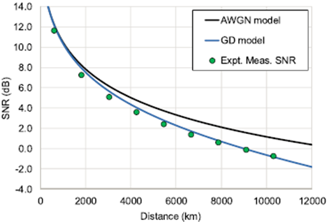 2020年6月,美國康寧研發(fā)公司和康寧科學(xué)中心的研究人員,在國際知名期刊Journal of Lightwave Technology,針對具有恒定輸出功率放大器系統(tǒng)建立了廣義下垂的SNR模型,并進行了實驗驗證。該模型對具有恒定功率放大器的海底光纜鏈路中廣義信號下垂模型進行了擴展和增強。實驗結(jié)果表明,該模型具有很好的精度。
