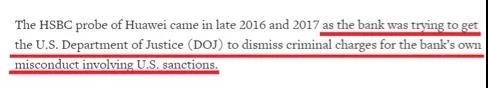 根據(jù)路透社當(dāng)時(shí)的報(bào)道,匯豐在2016年年底到2017年開(kāi)始“配合”美國(guó)司法部對(duì)華為發(fā)起的“調(diào)查”,原因是為了換取美國(guó)司法部對(duì)匯豐銀行的寬恕,因?yàn)閰R豐本身還涉及其他違反美國(guó)制裁禁令的案件。