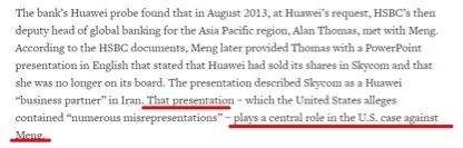 其中,如今被加拿大政府扣押的這位華為公司的高管與匯豐銀行的一位高管當(dāng)面進(jìn)行了溝通,表示華為沒(méi)有任何不合規(guī)的情況,并給這位匯豐高管提供了一份PPT文件說(shuō)明情況。