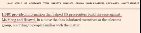 這些路透社報(bào)道的事件經(jīng)過(guò),在英國(guó)《金融時(shí)報(bào)》前兩天的最新報(bào)道中被再次提及。而且《金融時(shí)報(bào)》也在報(bào)道中寫(xiě)到了“匯豐給美國(guó)司法部起訴華為提供了信息和幫助”這樣的內(nèi)容。