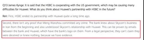 在回答《金融時(shí)報(bào)》記者提出關(guān)于“匯豐協(xié)助美國(guó)政府給華為制造麻煩”的問(wèn)題時(shí),任正非說(shuō):“這家銀行從一開(kāi)始就清楚Skycom在伊朗的業(yè)務(wù),也知道Skycom與華為的關(guān)系。華為和這家銀行之間的郵件可以證明,上面還有銀行的LOGO呢。所以從法律的角度來(lái)講,他們不能說(shuō)他們被騙了或者不知道,因?yàn)槲覀冇凶C據(jù)。”