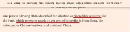 但一位給匯豐提供咨詢(xún)服務(wù)的人士對(duì)《金融時(shí)報(bào)》表示此事令匯豐正處在一個(gè)“極度敏感”的情況下,因?yàn)閰R豐近75%的收益來(lái)自中國(guó)大陸和中國(guó)香港特區(qū)。
