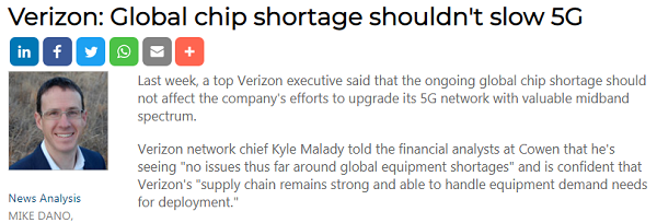 Verizon網(wǎng)絡(luò)負(fù)責(zé)人Kyle Malady告訴Cowen的金融分析師,他認(rèn)為“到目前為止,全球設(shè)備短缺方面沒有任何問題”,并認(rèn)為Verizon的“供應(yīng)鏈仍然強(qiáng)大并且能夠滿足部署所需的設(shè)備需求”。