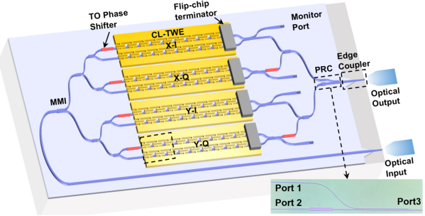 支持偏振復(fù)用的同向正交(Dual-polarization In-phase Quadrature, DP-IQ)調(diào)制器的作用是將數(shù)字電信號以傳輸效率更高的高階幅度相位調(diào)制格式加載到兩個(gè)偏振態(tài)相互正交的光載波上,是相干光通信系統(tǒng)發(fā)射端的核心關(guān)鍵器件,也是復(fù)雜程度最高的電光調(diào)制器。長久以來,世界各國都在致力于實(shí)現(xiàn)小型化、超大帶寬(>100 GHz)、超低驅(qū)動電壓(~1V)和高線性度的DP-IQ調(diào)制器。