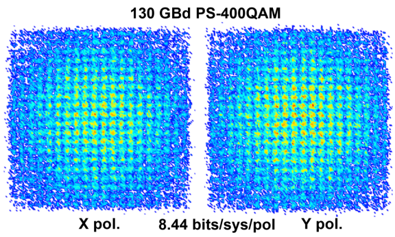 芯片中的四路MZM都具有低至1V的半波電壓,調(diào)制驅(qū)動電壓僅僅需要600 mV左右,可以由普通的低功耗CMOS芯片直接驅(qū)動,這一特性將在未來低功耗、低成本的光通信鏈路中發(fā)揮重要作用。利用該器件,研究團(tuán)隊(duì)展示了130 Gbaud的概率星座圖整形400 QAM(圖3)。器件在CMOS兼容的驅(qū)動電壓下,實(shí)現(xiàn)了單載波1.96 Tb/s的傳輸速率,這是目前單載波相干傳輸凈比特速率的世界紀(jì)錄,每比特的電功耗僅有1.04 fJ/bit。
