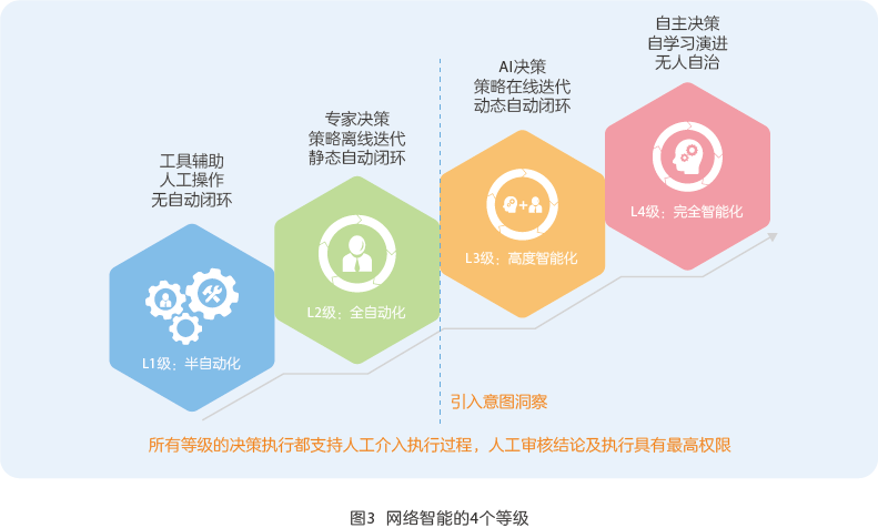 云網融合目標架構需要構建在網絡智能的基礎上。中興通訊提出網絡智能的4個等級,如圖3所示。