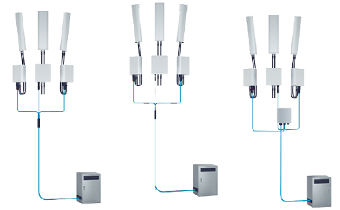 最初的連接方式是每臺RRU單獨光纖到BBU,這樣的好處是靈活方便,缺點是拉線多,耗材耗時成本高。為了優(yōu)化材料費用控制和減少現(xiàn)場施工人員的安裝耗時,分別又有了不同的Trunk室外防水多芯光纜組件方案。