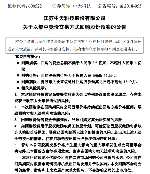 ICCSZ訊 (編輯:Nicole)中天科技發(fā)布公告稱(chēng):擬用公司自有資金以集中競(jìng)價(jià)交易方式回購(gòu)公司部分社會(huì)公眾股份,回購(gòu)的資金總額不低于2.5億元、不超過(guò)6億元,回購(gòu)股份的價(jià)格為不超過(guò)每股11.69元?;刭?gòu)期限自股東大會(huì)審議通過(guò)回購(gòu)股份預(yù)案之日起不超過(guò)12個(gè)月。