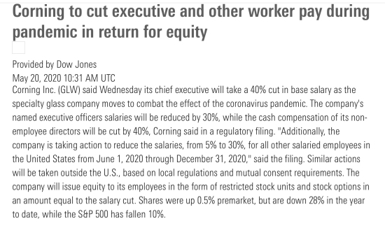 康寧在一份監(jiān)管文件中表示,從6月1日開始,公司首席執(zhí)行官的基本工資將降低40%,其他任命的執(zhí)行官的工資將降低30%,每位非雇員董事的現(xiàn)金報酬將減少40%。