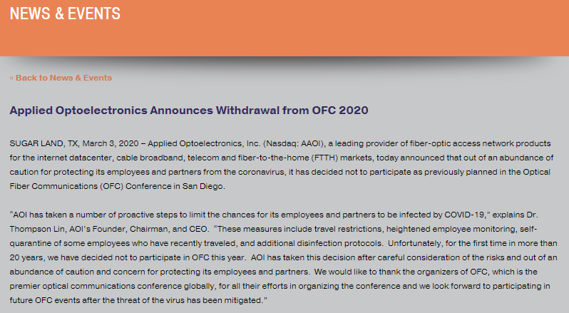 盡管決定退出OFC,但AOI仍將在3月10日(星期二)下午1點(東部時間/太平洋時間上午10:00),通過網(wǎng)絡(luò)視頻的方式來主持原計劃安排的OFC投資者會議,會議將由首席財務(wù)官兼首席戰(zhàn)略官Stefan Murry主持。