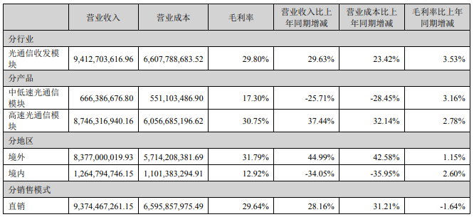 報告期內(nèi),受數(shù)據(jù)流量和帶寬需求快速增長的影響,海外重點客戶繼續(xù)加大資本開支投入并帶動對數(shù)據(jù)中心 400G 和 200G 等高端產(chǎn)品的需求上量。公司保障全面交付能力,持續(xù)降本增效,高端產(chǎn)品出貨量占營收比重進一步提升。此外,公司海外銷售收入占比較高,并以美元為結(jié)算貨幣,報告期內(nèi)美元兌人民幣的匯率波動也對收入及毛利率帶來一定正向影響。