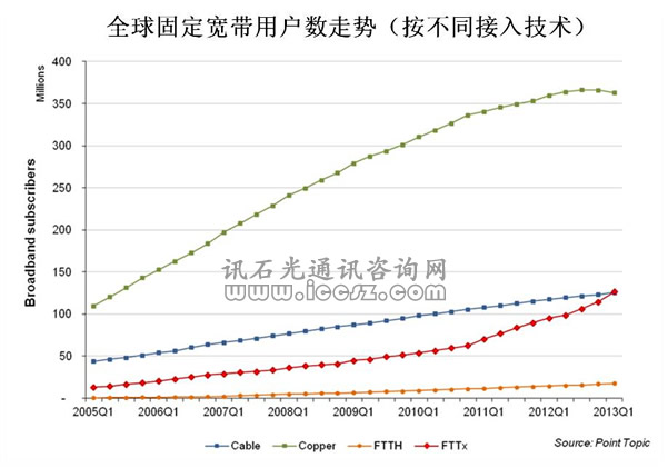 基于銅線的寬帶服務(wù)包括DSL、ADSL和ADSL2+。Point Topic的統(tǒng)計范圍還包括Cable用戶數(shù)、FTTx/VDSL和FTTH用戶。