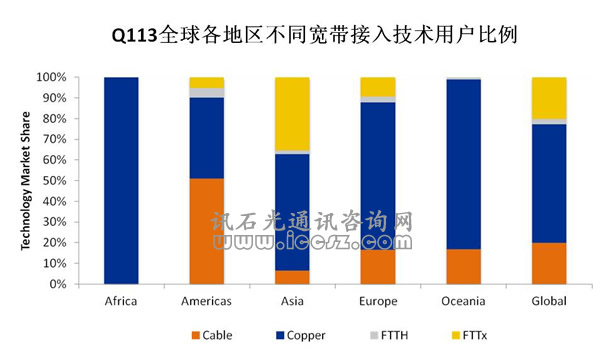 基于銅線用戶的減少主要發(fā)生在亞洲市場,同時非洲地區(qū)則是唯一一處基于銅線用戶還在增長的市場。