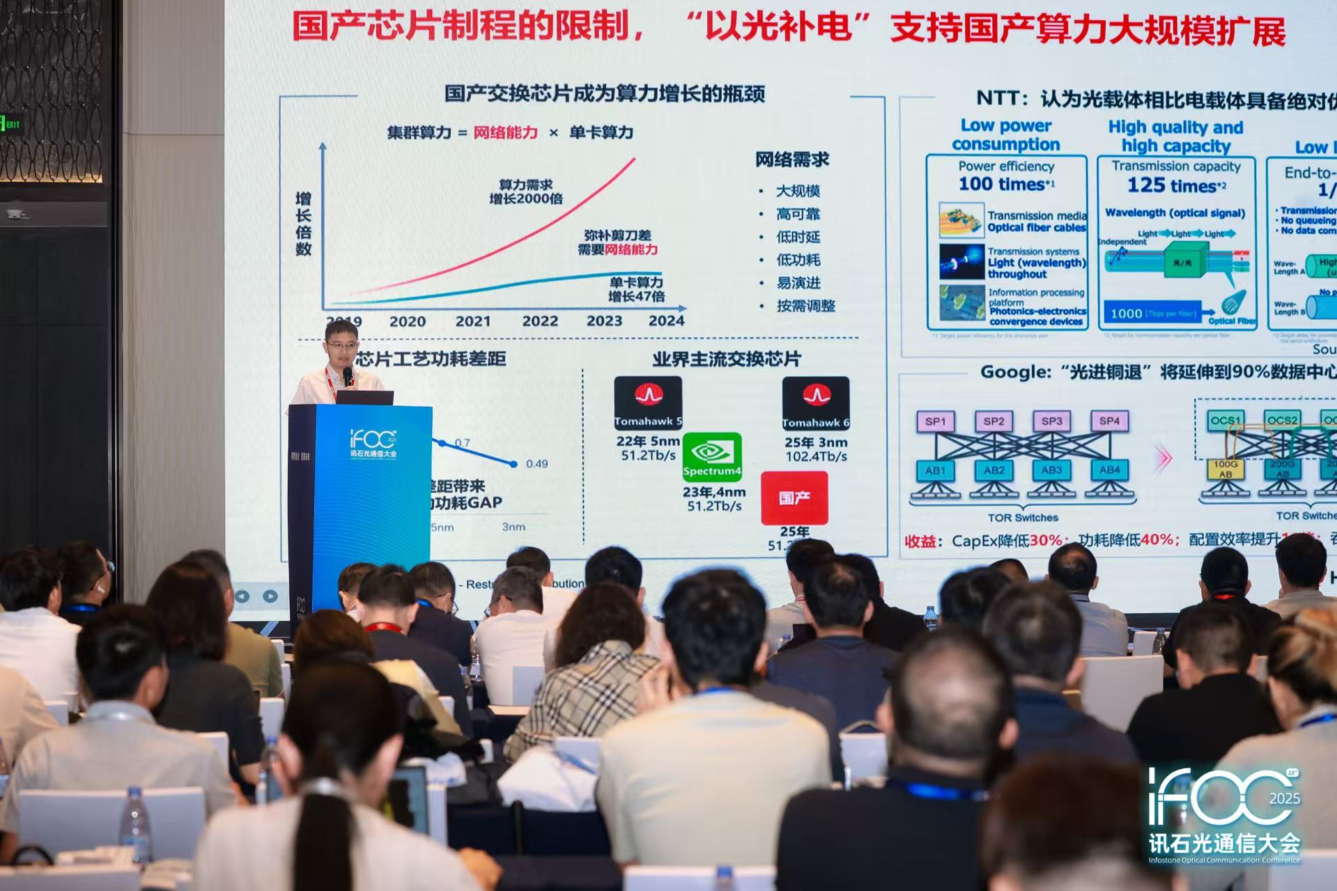 華為光產(chǎn)品線技術(shù)規(guī)劃專家孫光輝以《光互聯(lián)助力AI算力釋放》為題,分享了智算網(wǎng)絡(luò)的主要趨勢(shì)與進(jìn)展、光互聯(lián)解決方案及其實(shí)應(yīng)用與收益分析;他先從國(guó)產(chǎn)交換芯片算力增長(zhǎng)瓶頸切入,指出芯片產(chǎn)業(yè)中光載體相較電載體的絕對(duì)優(yōu)勢(shì),介紹了谷歌、英偉達(dá)在光互連領(lǐng)域的發(fā)展及業(yè)界對(duì)該產(chǎn)業(yè)的評(píng)估,再以基于DC-OXC的光電混合AI集群參數(shù)面方案為例,闡明光互連對(duì)AI訓(xùn)練的重要性,還介紹了光電混合智算DCN管控框架及已完成的訓(xùn)練、推理相關(guān)參數(shù),強(qiáng)調(diào)其在拓?fù)淇烧{(diào)、時(shí)延、功耗等方面的顯著收益,最后分享利用超節(jié)點(diǎn)保護(hù)資源池的新方案,以提升資源利用率。