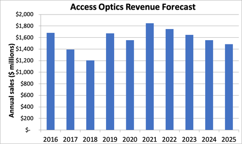 2020年,全球接入光學(xué)市場將消耗近1億只模塊和器件,為供應(yīng)商帶來近16億美元的收入。其中,FTTx將約占出貨量的三分之二和收入的三分之一,前傳收發(fā)器約占出貨量的三分之一和收入的一半。明年,需求將達到頂峰,此后將逐漸下降,因為中國的接入部署將逐漸減少,同時世界其他地區(qū)的增長仍不能完全抵消中國需求下降的影響。