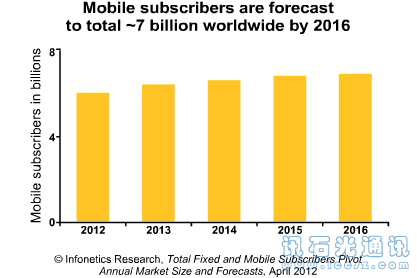 移動用戶數(shù)——包括GSM, W-CDMA, LTE, TD-SCDMA, cdmaOne, CDMA2000,預計在2012年將突破60億大關,2016年將達70億。
