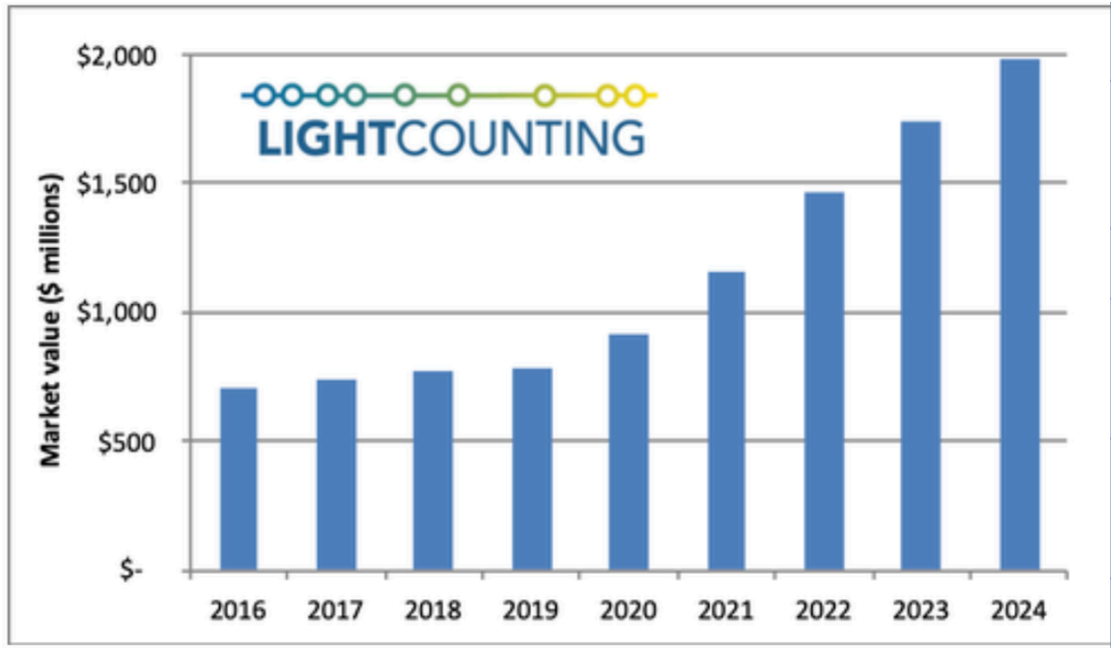 LigthCounting預(yù)測(cè)2020-2024全球光模塊芯片市場(chǎng)走勢(shì)(來源:橙科微電子報(bào)告)