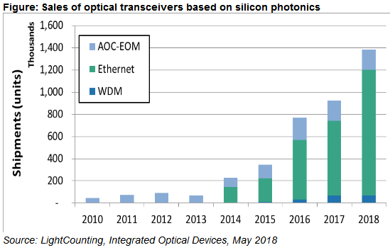 無論如何,硅光子技術(shù)的進步是令人鼓舞的。根據(jù)LightCounting在2018年5月發(fā)布的集成光學器件報告,基于硅光子組件的光模塊銷售額在2015年和2016年翻了一番,2017年增速放緩到22%。與爆發(fā)式增長預(yù)期相反,LC分析認為,硅光子技術(shù)將逐步獲得市場份額,預(yù)計2023年銷售額達到24億美元。