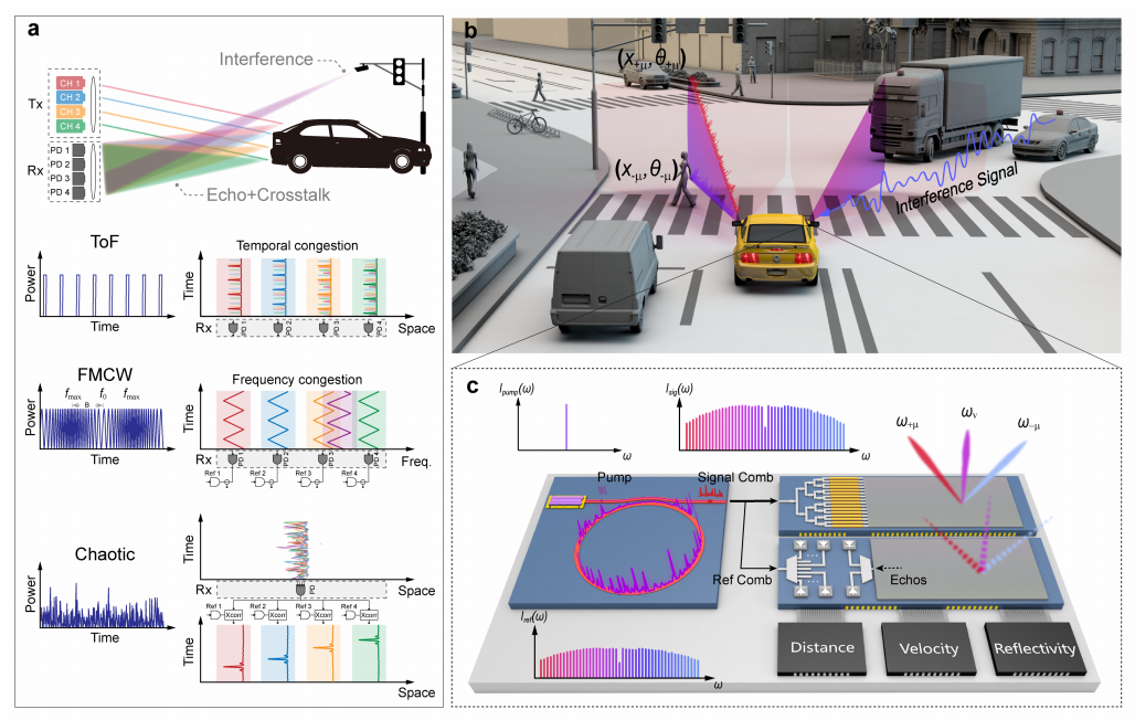 隨著高級別自動駕駛的日益普及,確保行駛舒適安全的激光雷達(dá)作為其核心器件,受到越來越多的重視。高性能、小體積、低成本、低功耗、高安全的激光雷達(dá)是未來廠商競相追逐的方向。北京大學(xué)電子學(xué)院王興軍教授課題組-常林研究員課題組在兩年攻關(guān)的基礎(chǔ)上,研制出一種全新的硅基片上多通道混沌光源,提出了一種基于混沌光梳的并行激光雷達(dá)架構(gòu),攻克了激光雷達(dá)抗干擾和高精度并行探測這兩個世界性難題,保證高性能高安全的同時,極大降低未來激光雷達(dá)系統(tǒng)體積、復(fù)雜度、功耗和成本。團(tuán)隊的研究成果 “Breaking the temporal and frequency congestion of LiDAR by parallel chaos” 發(fā)表在2023年3月13日的《自然-光子學(xué)》(Nature Photonics)雜志。