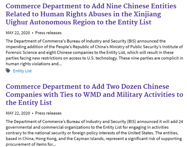 美國商務(wù)部表示,把這些實體和個人列入“實體名單”,將限制這些公司和組織在沒有得到美國政府具體批準的情況下使用含有美國技術(shù)的產(chǎn)品。