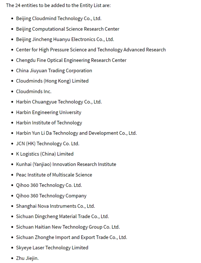 而在另一份聲明中,美國商務(wù)部說,24家位于中國大陸、香港及開曼群島等的中國企業(yè)、政府機構(gòu)和商業(yè)組織因“為中國軍方使用的物品采購提供支持”、“與美國國家安全或外交政策利益背道而馳”而被列入實體清單中,其中包括北京計算機科學(xué)研究中心、北京高壓科學(xué)研究中心、成都精密光學(xué)工程研究中心、達闥(香港)有限公司、哈爾濱工程大學(xué)、哈爾濱工業(yè)大學(xué)、精納(香港)科技有限公司、快急送物流(中國)有限公司、奇虎360有限公司、礪劍天眼科技有限公司以及復(fù)旦大學(xué)副教授朱杰進。
