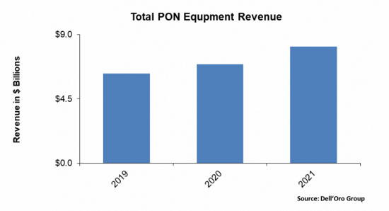 2020年的光纖擴(kuò)張使全球PON設(shè)備(包括從1G EPON和2.5G GPON到XG-PON以及XGS-PON的多種技術(shù))的總支出增長(zhǎng)了8%,而2021年預(yù)計(jì)將出現(xiàn)更大幅度的增長(zhǎng)。雖然運(yùn)營(yíng)商的明顯趨勢(shì)是使用10G技術(shù)擴(kuò)展其光纖服務(wù),但仍有數(shù)百家運(yùn)營(yíng)商將在未來(lái)幾年繼續(xù)依賴2.5G GPON作為其光纖網(wǎng)絡(luò)的主力。