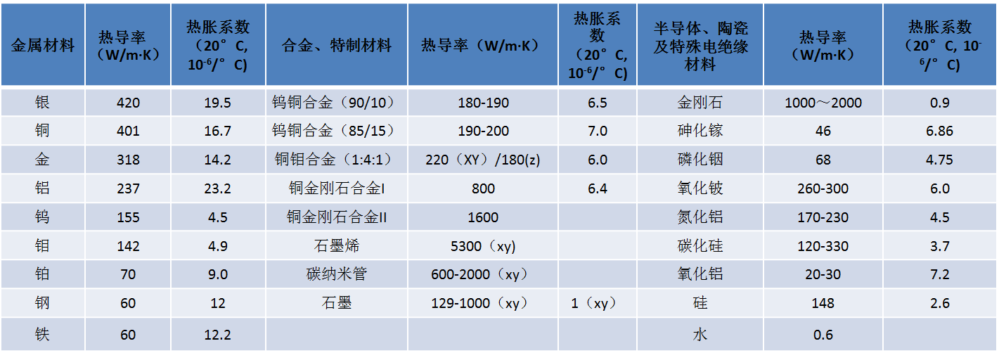 下圖匯總了一些常用材料作為熱沉的性能對(duì)比: