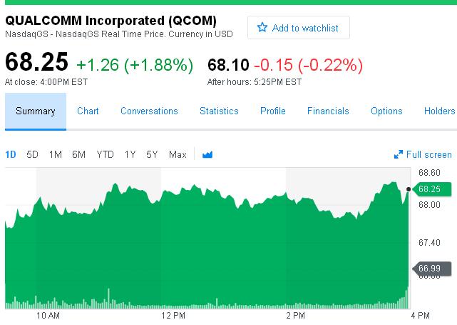周三納斯達(dá)克股市收盤,高通股價(jià)上揚(yáng)1.26美元,收于68.25美元,漲幅為1.88%。盤后交易市場(chǎng)高通股價(jià)微跌,截至美東時(shí)間1月31日下午17:25(北京時(shí)間2月1日早6:25),高通股價(jià)跌0.15美元,跌幅為0.22%,暫報(bào)68.10美元。過去52周高通股價(jià)浮動(dòng)范圍:48.92美元-69.28美元。