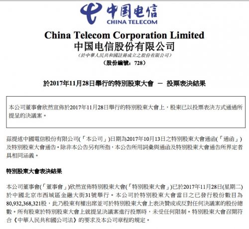 ICCSZ訊 11月29日消息,中國電信昨日晚間發(fā)布公告稱,特別股東大會已經(jīng)通過批準劉愛力擔任本公司董事職務(wù),任期自2017年11月28日起至本公司于2020年召開的2019年度股東周年大會為止。
