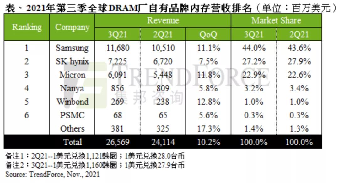 2021年三季度,SK海力士占據(jù)全球DRAM市場27.2%的市場份額 數(shù)據(jù)來源:TrendForce集邦咨詢