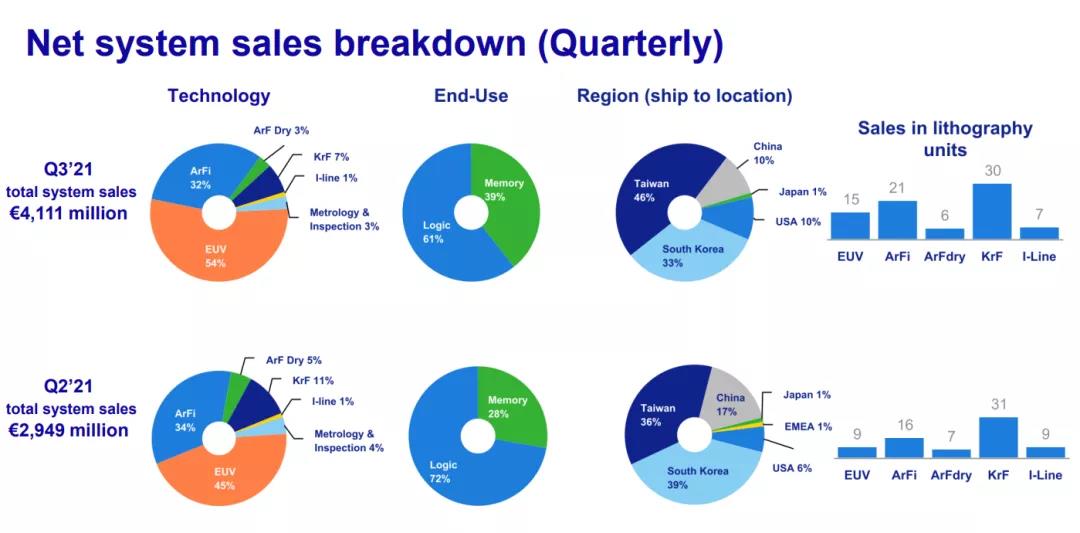 2021年三季度財(cái)報(bào)顯示,中國臺(tái)灣超越韓國成為阿斯麥最大市場,占比為46%,環(huán)比增長10個(gè)百分點(diǎn);韓國為阿斯麥第二大市場,占比為33%,環(huán)比下滑6個(gè)百分點(diǎn);中國大陸和美國并列第三大市場,占比均為10%,其中中國大陸的占比環(huán)比下滑7個(gè)百分點(diǎn),美國的占比環(huán)比提升4個(gè)百分點(diǎn);日本為第四大市場,占比為1%。