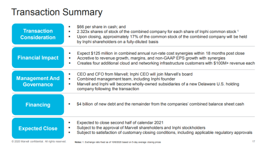根據(jù)協(xié)議條款,Marvell將以66美元的現(xiàn)金和合并后公司的2.323股股票換購每股Inphi股票。交易完成后,Marvell股東將擁有合并后公司約83%的股份,Inphi股東將擁有剩余約17%的股份。