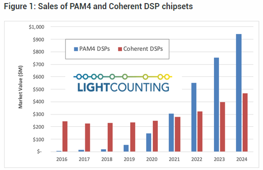 LC表示,光接口IC芯片組市場正處于拐點,該市場預計從2020年到2024年間將以20%的年復合增長率增長(如下圖所示)。用于DWDM光接口的相干DSP芯片和用于以太網(wǎng)收發(fā)器的PAM4 DSP的銷售將對該市場的增長做出最大貢獻。
