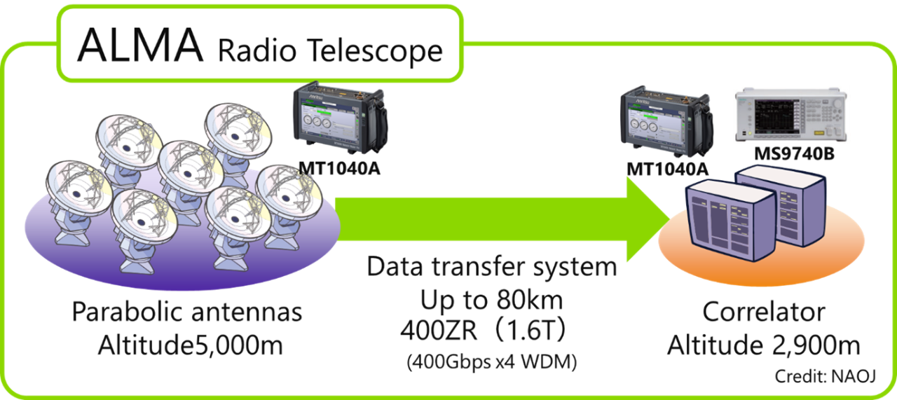 NAOJ深度參與了ALMA的運營,ALMA由包括日本在內(nèi)的22個國家和地區(qū)的全球伙伴關(guān)系監(jiān)督,負(fù)責(zé)提高射電望遠(yuǎn)鏡的性能,使其進入2030年代(寬帶靈敏度升級(WSU))。NAOJ正在與美國國家射電天文臺(NRAO)合作,使用400ZR標(biāo)準(zhǔn)實現(xiàn)天線(射電望遠(yuǎn)鏡)和相關(guān)器(超級計算機)之間的大量觀測數(shù)據(jù)通信,目前正在考慮1.6 Tbps的高速通信。與400ZR標(biāo)準(zhǔn)兼容的MT1040A被選擇用于評估DTS;MT1040A具有以一秒間隔顯示物理層測量結(jié)果、允許詳細(xì)評估大量天文數(shù)據(jù)傳輸質(zhì)量的功能。此外,已選擇MS9740B在DTS評估期間監(jiān)測傳輸信號的光波長。