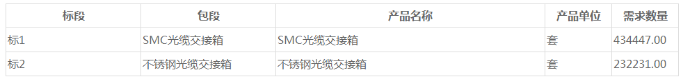 ICCSZ訊 (編輯:Nicole)中國(guó)移動(dòng)發(fā)布2018年至2019年光纜交接箱產(chǎn)品集中采購(gòu)公告,標(biāo)段劃分及預(yù)估采購(gòu)規(guī)模如下:標(biāo)段一,SMC光纜交接箱43.45萬(wàn)套;標(biāo)段二,雙層不銹鋼光纜交接箱23.22萬(wàn)套。