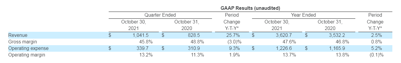 Ciena 2021財(cái)年收入36.21億美元,同比增長(zhǎng)2.5%。2021財(cái)年凈收入5億美元,每股攤博收益3.19美元,去年同期凈收入3.61億美元,每股攤博收益2.32美元。GAAP毛利率為47.6%,去年同期為46.8%,同比增長(zhǎng)0.8個(gè)百分點(diǎn)。