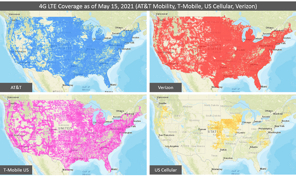 該地圖顯示了截至2021年5月15日,美國(guó)四大移動(dòng)運(yùn)營(yíng)商的4G LTE寬帶數(shù)據(jù)和語(yǔ)音移動(dòng)覆蓋情況。這些數(shù)據(jù)是由這些運(yùn)營(yíng)商自愿提交的,超出了FCC通過(guò)FCC Form 477接收數(shù)據(jù)的正常時(shí)間表。如果其他運(yùn)營(yíng)商有興趣提供類(lèi)似的自愿標(biāo)準(zhǔn)化資料,請(qǐng)與寬帶數(shù)據(jù)專(zhuān)責(zé)小組聯(lián)系。