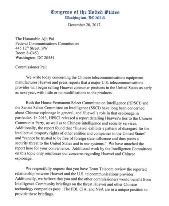 ICCSZ訊 2018年CES第一天,來自外媒的彭博社稱華為手機(jī)未能與AT&T達(dá)成合作協(xié)議。之后就有媒體曝光了“美國18名國會(huì)議員聯(lián)名致信聯(lián)邦通信委員會(huì)(FCC)主席艾吉特·帕伊(Ajit Pai)”的郵件,主要內(nèi)容是,要求FCC對華為與美國運(yùn)營商的合作展開調(diào)查。并認(rèn)為是該郵件導(dǎo)致了雙方合作流產(chǎn)。
