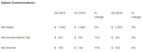 對(duì)于2019年全年,康寧預(yù)計(jì)光通信部門(mén)銷(xiāo)售收入年增幅將在中低個(gè)位數(shù)。公司下調(diào)全年增長(zhǎng)預(yù)期主要是由于運(yùn)營(yíng)商市場(chǎng)的疲軟,但光通信的增速仍然遠(yuǎn)高于無(wú)源光學(xué)市場(chǎng)增長(zhǎng)。在今年6月份的投資者會(huì)議上,康寧高管曾表示,在5G移動(dòng)網(wǎng)絡(luò)和超大規(guī)模數(shù)據(jù)中心兩個(gè)新興市場(chǎng)的驅(qū)動(dòng)下,光通信業(yè)務(wù)部門(mén)的增長(zhǎng)速度大約是無(wú)源光學(xué)市場(chǎng)(即光纖寬帶接入網(wǎng)建設(shè))驅(qū)動(dòng)時(shí)代的兩倍。