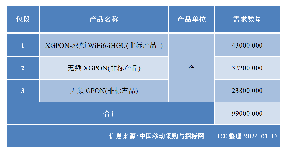 ICC訊 近日,中國(guó)移動(dòng)于官網(wǎng)發(fā)布招標(biāo)公告,稱“黑龍江移動(dòng)2024年一季度智能家庭網(wǎng)關(guān)產(chǎn)品公開(kāi)采購(gòu)”項(xiàng)目,已具備采購(gòu)條件,現(xiàn)進(jìn)行公開(kāi)比選。項(xiàng)目編號(hào): :HLYD20240500046