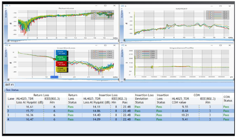 ML4035幾乎涵蓋DAC無源cable標(biāo)準(zhǔn)測試里的所有S參數(shù),其中包括Impedance、Return Loss、Insertion loss、FEXT、NEXT、ICN及COM等,覆蓋10G-800G的DAC測量。在測量S參數(shù)的同時,由于其擁有35GHz的電采樣示波器,還可以自建電眼模板進行電眼margin、眼高等參數(shù)的測量,讓測試結(jié)果更加精準(zhǔn)。ML1105是MultiLane幫生產(chǎn)客戶開發(fā)的自動化DAC測試程序,將所有測試相關(guān)的參數(shù)、校準(zhǔn)及文件保存等內(nèi)容都已經(jīng)寫好在程序里,客戶直接按步驟操作測試即可以完成測量,最后生成測試報告。