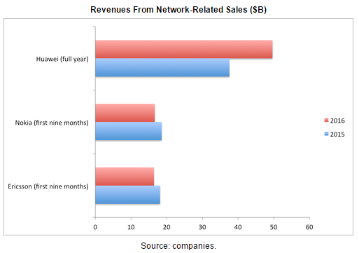 雖然華為、愛立信和諾基亞都在網(wǎng)絡(luò)設(shè)備服務(wù)市場(chǎng)上從運(yùn)營(yíng)商和企業(yè)客戶那里賺取大量收入,但三家公司來自該市場(chǎng)收入占總比卻是不同,其中華為是66%,也就是三分之一來自手持設(shè)備市場(chǎng)(主要是智能手機(jī));占比最高的是愛立信,2016年前9個(gè)月高達(dá)94%;諾基亞同期網(wǎng)絡(luò)業(yè)務(wù)也占到總收入91%。盡管如此,2016年前9個(gè)月,愛立信來自網(wǎng)絡(luò)設(shè)備服務(wù)的收入下降了9.5%,諾基亞下降了11%。