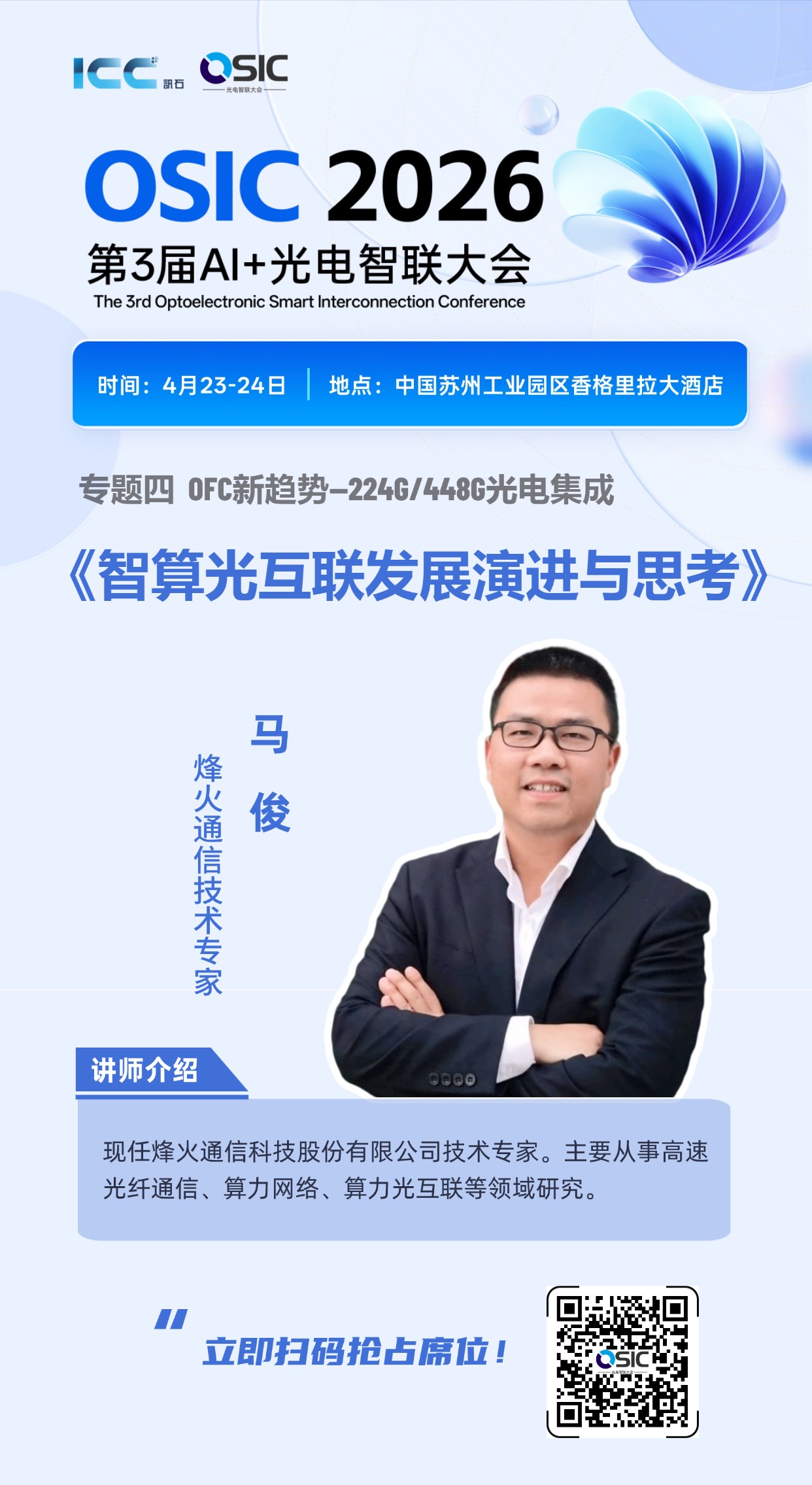 演講時(shí)間、專題:2026年4月24日 下午16:20-16:45,專題四:OFC新趨勢—224G/448G光電集成