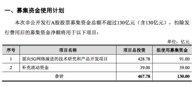 根據(jù)議案,本次募集資金主要用于投入中興通訊“面向5G網(wǎng)絡(luò)演進的技術(shù)研究和產(chǎn)品開發(fā)項目”,包括蜂窩移動通訊網(wǎng)絡(luò)技術(shù)研究和產(chǎn)品開發(fā)、核心網(wǎng)技術(shù)研究和產(chǎn)品開發(fā)、傳輸與承載網(wǎng)技術(shù)研究和產(chǎn)品開發(fā)、固網(wǎng)寬帶技術(shù)研究和產(chǎn)品開發(fā)、大數(shù)據(jù)與網(wǎng)絡(luò)智能技術(shù)研究和產(chǎn)品開發(fā)。該項目計劃總投資428.78億元,擬使用募集資金91億元。另外39億元用于補充流動資金。