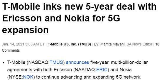 這家聲稱要“去運(yùn)營商(Uncarrier)”的公司已經(jīng)與這兩家歐洲設(shè)備供應(yīng)商在5G領(lǐng)域合作了一段時(shí)間,還在2018年分別與它們簽署了35億美元的協(xié)議。T-Mobile去年表示,在與Sprint合并后,它將在為期三年、耗資430億美元的網(wǎng)絡(luò)升級(jí)項(xiàng)目中使用諾基亞和愛立信的5G設(shè)備。