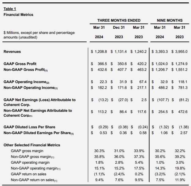 ICC訊(編譯:Nina)美國賓州匹茲堡,2024年5月6日--Coherent Corp.(納斯達(dá)克:COHR)(“Coherent”或“公司”),一家材料、網(wǎng)絡(luò)和激光器領(lǐng)域的全球領(lǐng)導(dǎo)者,今天公布了其截至2024年3月31日的2024財(cái)年第三季度業(yè)績。