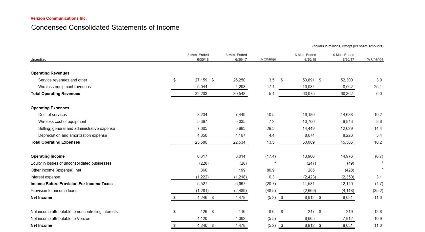 Verizon本季度營業(yè)收入為322億美元,較2017年同期增長5.4%,凈收入下降5.2%至42億美元。該運(yùn)營商表示,Verizon的稅后收入為9億美元,主要原因是其Go90視頻服務(wù)被關(guān)閉。分部門來看,Verizon Wireless收入為224.49億美元,同比增長5.5%。Verizon Wireline收入為74.59億美元,同比下滑3.4%。Verizon Wireless強(qiáng)勁的收入增長勢頭和運(yùn)營業(yè)績突出了Verizon Communications Inc. 2018年第二季度的業(yè)績。