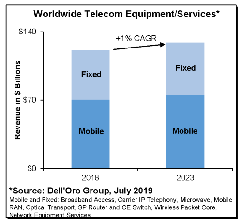 ICCSZ訊(編譯:Nina)Dell'Oro最近發(fā)布的電信基礎(chǔ)設(shè)施和服務(wù)市場(chǎng)五年預(yù)測(cè)報(bào)告顯示,未來(lái)五年,整體電信設(shè)備和服務(wù)市場(chǎng)預(yù)計(jì)將以1%的復(fù)合年增長(zhǎng)率增長(zhǎng),從2018年的1210億美元增長(zhǎng)至2023年的1290億美元。在預(yù)測(cè)期間,兩大應(yīng)用市場(chǎng)移動(dòng)和固網(wǎng)都將以1%的年復(fù)合增長(zhǎng)率增長(zhǎng),與整體市場(chǎng)增長(zhǎng)同步。